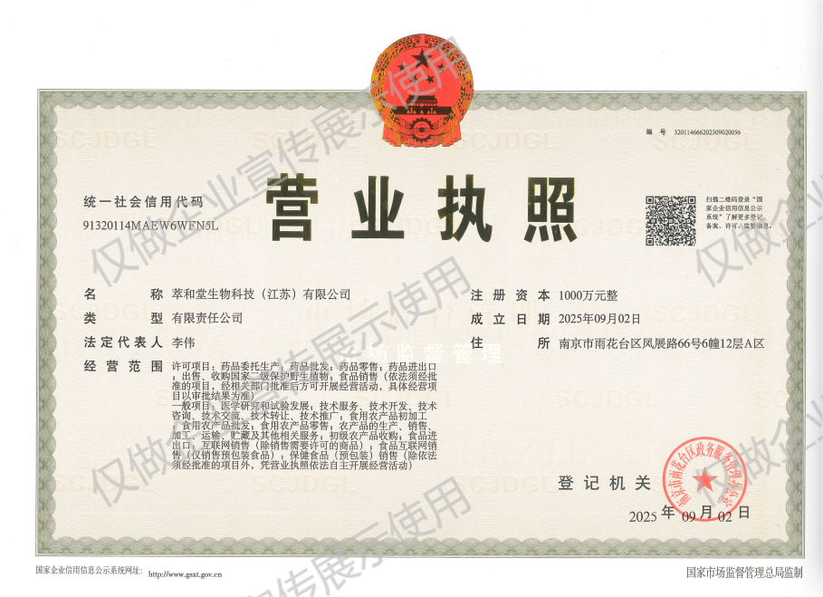 2025年9月2日,萃和堂生物科技(江蘇)有限公司(簡(jiǎn)稱“萃和堂”)正式成立,統(tǒng)一社會(huì)信用代碼:91320114MAEW6WFN5L,注冊(cè)資本金1000萬元。由新立訊科技集團(tuán)股份有限公司、北京金來順投資有限公司與遵義廖元和堂藥業(yè)有限公司按17:2:1聯(lián)合投資設(shè)立。“萃和堂”將依托青海省的枸杞、蟲草、鹿茸、黃精等特色農(nóng)產(chǎn)品資源,深度融合中華老字號(hào)“廖元和堂”與“中國(guó)非遺”發(fā)酵工藝飲片(含片)生產(chǎn)資質(zhì)與成熟技術(shù),從初加工農(nóng)產(chǎn)品到精制加工的中藥飲片(含片)系列大健康消費(fèi)品,助力“青貨出青”鄉(xiāng)村振興戰(zhàn)略。