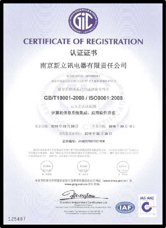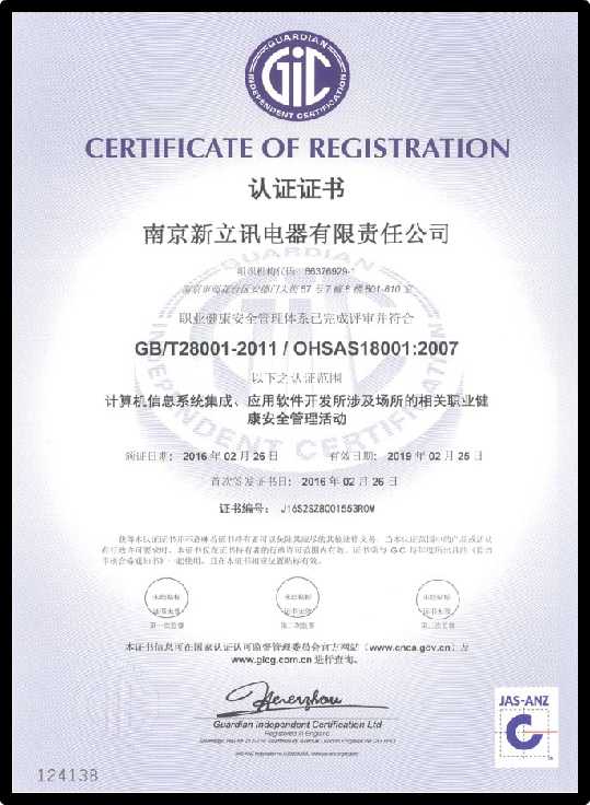 2016年2月28日,經過嚴格有序的認證審核,審核組專家就南京新立訊電器有限責任公司體系運行現(xiàn)狀的具體情況進行總結,并給予了客觀的評價。專家組表示,新立訊 ISO三大管理體系運行狀況良好,符合體系認證的要求。經過專家組的認定和審核,南京新立訊電器有限責任公司順利通過了ISO9001質量管理體系、ISO14001環(huán)境管理體系、OHSAS18001職業(yè)健康安全管理體系認證,獲得了相關證書。此次三大管理體系的認證,標志著新立訊企業(yè)質量管理水平和管理理念的不斷提升,為企業(yè)向社會提供優(yōu)質的產品和服務提供了強有力的保障。