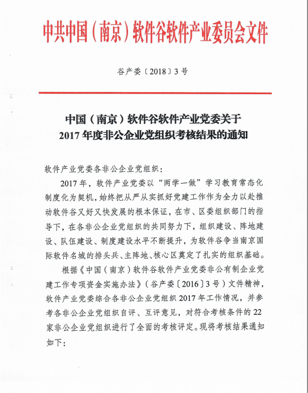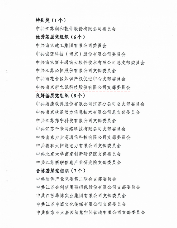 2018年5月8日,根據(jù)《中國(guó)(南京)軟件谷軟件產(chǎn)業(yè)黨委關(guān)于2017年度非公企業(yè)黨組織考核結(jié)果的通知》,中共南京新立訊科技股份有限公司支部委員會(huì)榮獲“優(yōu)秀基層黨組織”榮譽(yù)稱號(hào)。