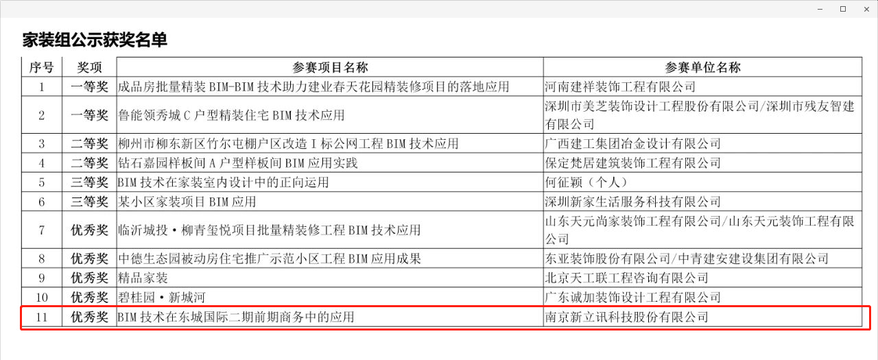 近期,新立訊參報(bào)的《BIM技術(shù)在某建筑群前期商務(wù)中的應(yīng)用》和《BIM技術(shù)在裝飾審計(jì)結(jié)算中的應(yīng)用》兩個(gè)項(xiàng)目均獲得由中國建筑裝飾協(xié)會主辦的《首屆中國建筑裝飾BIM大賽》優(yōu)秀獎。
