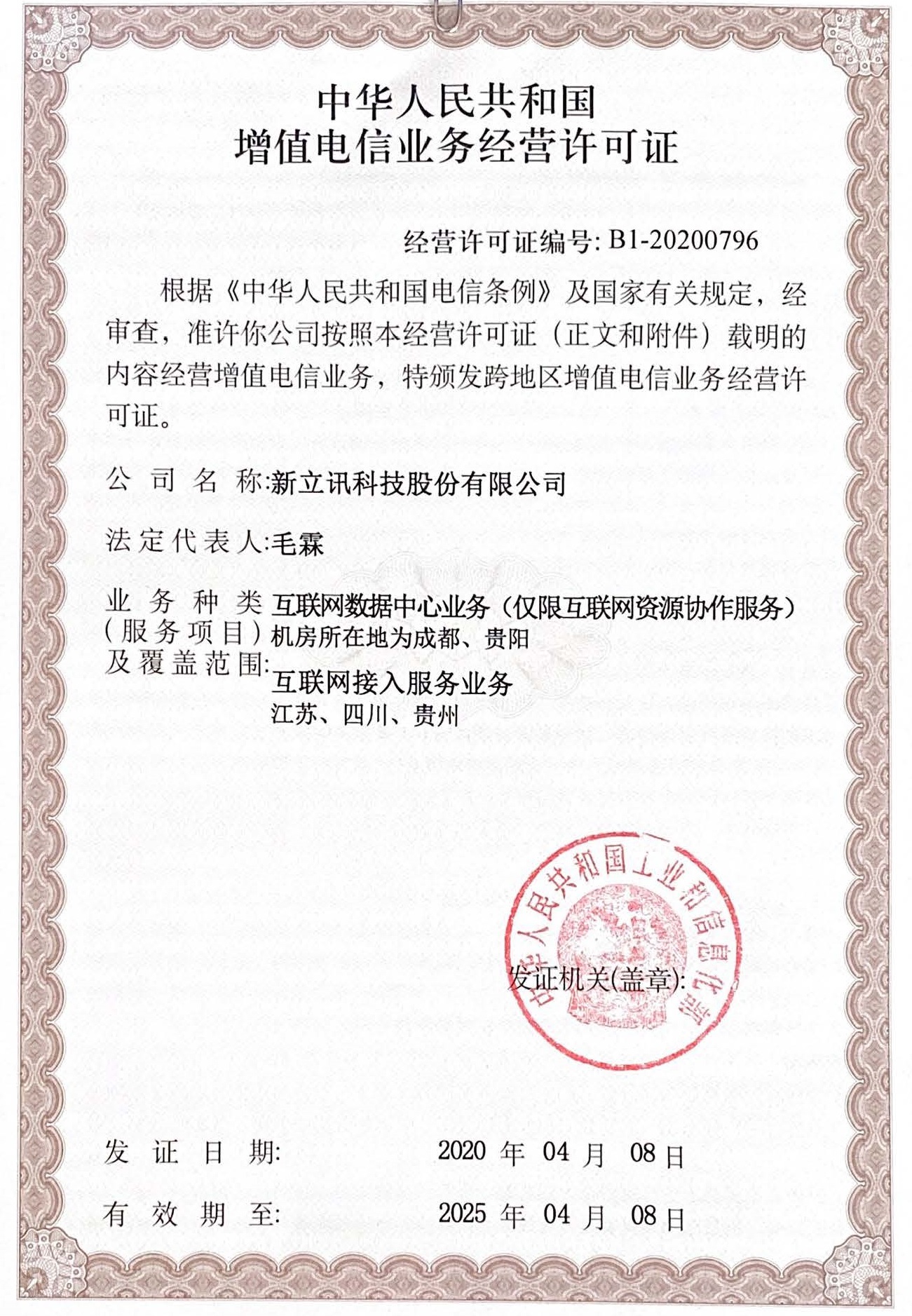 新立訊公司現(xiàn)已累計獲得:互聯(lián)網信息服務業(yè)務、互聯(lián)網接入服務(ISP)業(yè)務、互聯(lián)網數(shù)據中心業(yè)務(IDC)增值電信牌照。實現(xiàn)較為完善互聯(lián)網數(shù)據中心布局,本次取得新的業(yè)務經營許可證是相關行業(yè)監(jiān)管部門對新立訊近年來業(yè)務經營能力及成果的充分肯定,也是新立訊業(yè)務擴張策略和企業(yè)轉型布局的重要體現(xiàn),是新立訊又一重要里程碑時刻。今后,新立訊將繼續(xù)秉承“服務社會、創(chuàng)造價值”的企業(yè)使命,積極創(chuàng)新,不斷為客戶提供更專業(yè)、穩(wěn)健、高效的綜合數(shù)據業(yè)務,服務國家戰(zhàn)略“新基建”建設。