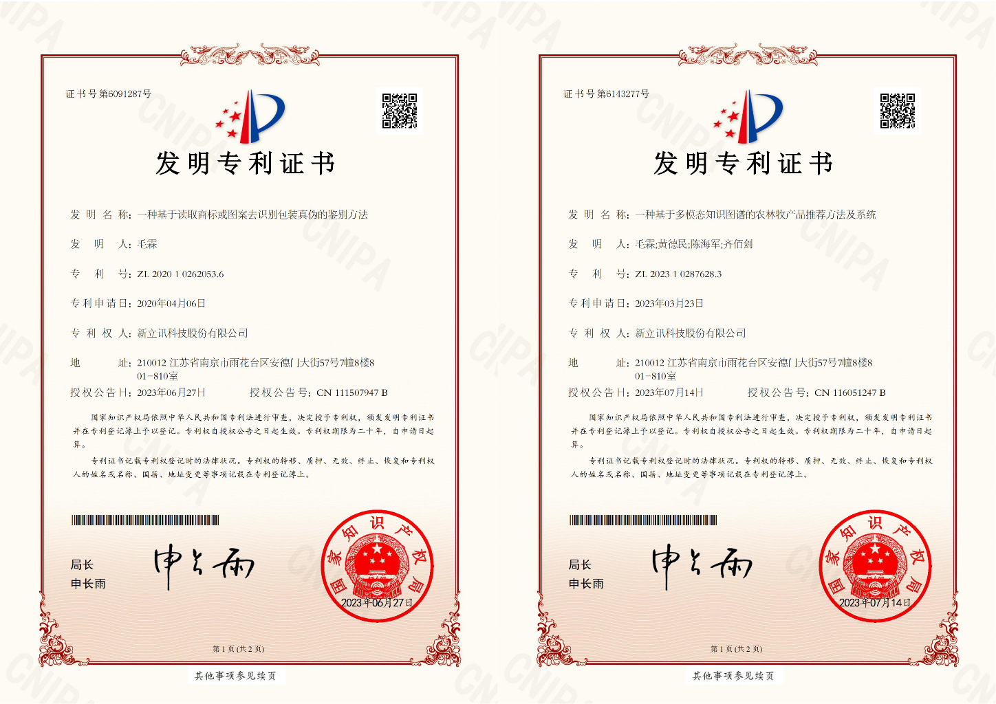 7月,新立訊知識產(chǎn)權(quán)領(lǐng)域再獲兩項發(fā)明專利,分別是“一種基于讀取商標或圖案去識別包裝真?zhèn)蔚蔫b別方法”(專利號:ZL202010262053.6),“一種基于多模態(tài)知識圖譜的農(nóng)林牧產(chǎn)品推薦方法及系統(tǒng)”(專利號:ZL202310287628.3)均為我司原始取得,是技術(shù)創(chuàng)新和研發(fā)方面取得的重要成果。