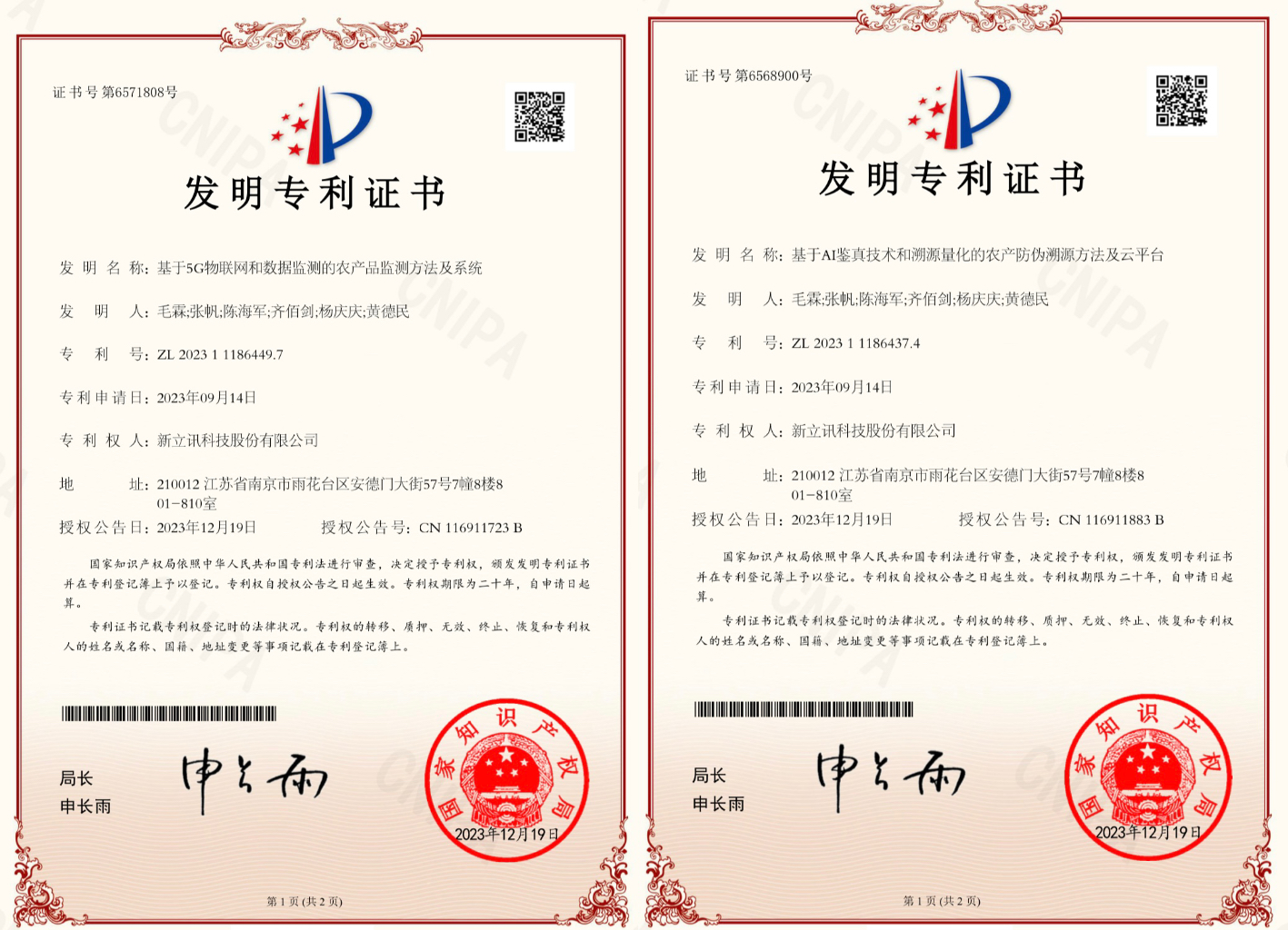 2023年12月,新立訊在農(nóng)產(chǎn)數(shù)據(jù)交易領(lǐng)域再獲4項(xiàng)發(fā)明專利。發(fā)明專利涵蓋了農(nóng)產(chǎn)數(shù)據(jù)交易與防偽鑒真多個(gè)方面,包括數(shù)據(jù)采集、處理、分析和應(yīng)用等,將有效提高農(nóng)產(chǎn)交易數(shù)據(jù)效率和可持續(xù)性。